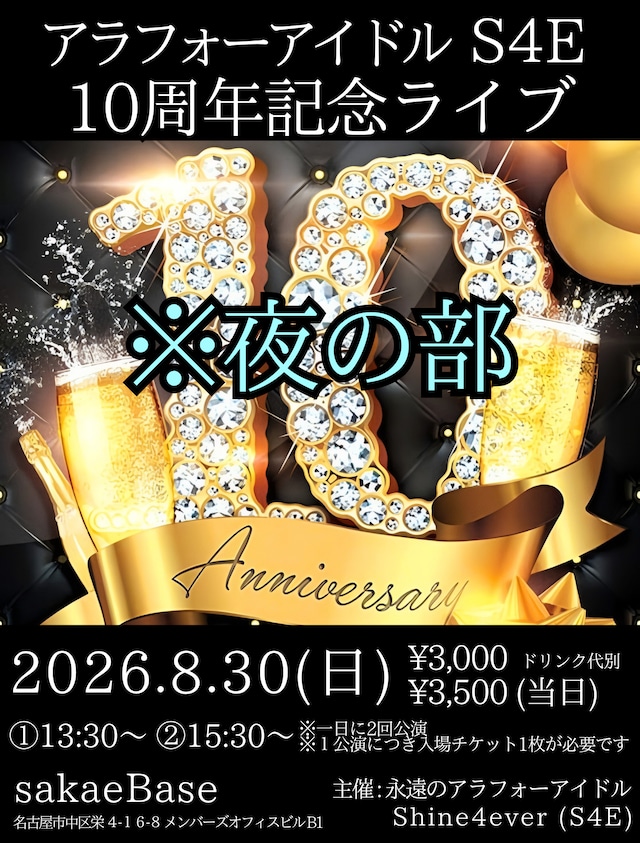 Shine4ever 10周年記念ライブ 日程:2026/8/30(日) ※一日2公演 第一部(マチネ) 13:00 Open 13:30 Start 14:45 Close 第二部(ソワレ) 15:00 Open 15:30 Start 16:45 Close (この商品は夜の部のチケットです) 料金: 前売り3,000円 当日3,500円 ※ドリンク代別 ※電子決済については当日店舗にてご確認下さい 会場: Cafe&Bar SakaeBase 〒460-0008 愛知県名古屋市中区栄4丁目16-8 メンバーズオフィスビルB1 公式LINEへの登録をおすすめしています https://lin.ee/GJz1C35 https://ameblo.jp/shineforever0701/entry-12945354596.html